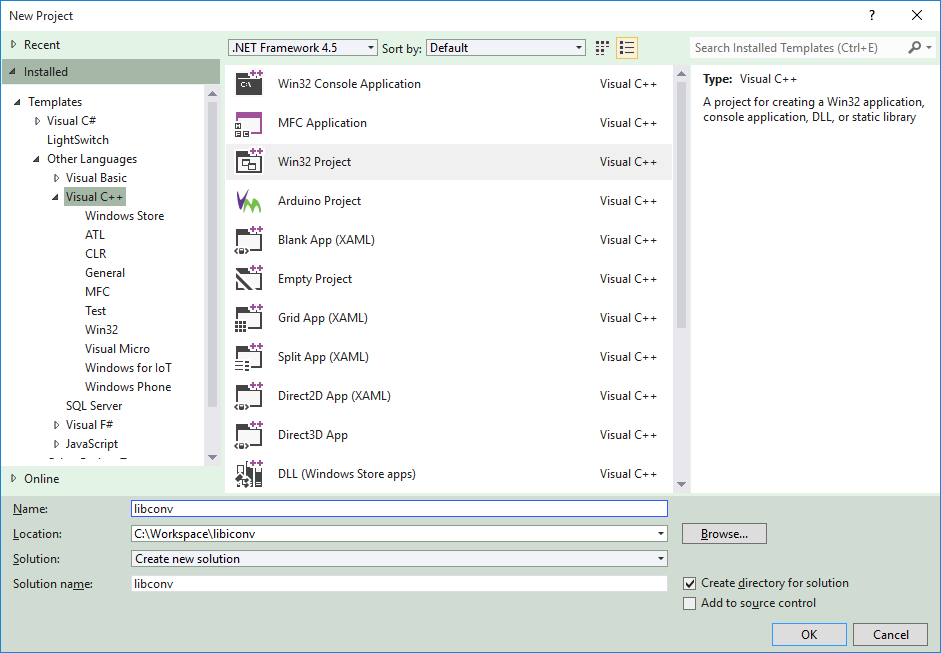 Let's say "libiconv" as the project name. Check to create directory for solution.