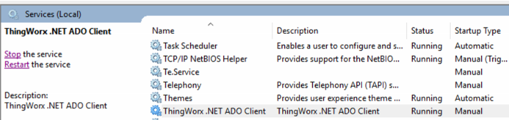 13. Check for the service ThingWorx .NET ADO Client as you'll have to start it if it's set to Manual, like so in my case
