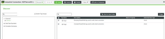 - The Industrial Connections entity allows you to connect with and configure industrial things in ThingWorx. With the “Discover” feature, you could easily bind the Industrial device’s (e.g., Kepware) Tags to a ThingWorx Entity