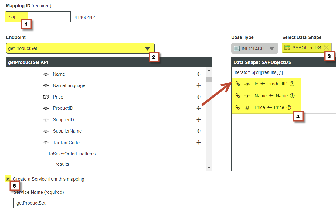 - Select DataShape : SAPObjectDS (created at step 1) and map the following attributes :