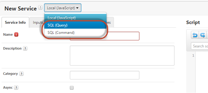 3. A new service creation section will come up, change the Service type of JavaScript (this is default selection) to either SQL (Query) or SQL (Command) depending on the type of SQL you are to create under this particular service