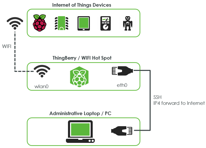 In this particual blog post we'll discuss on how to setup the ThingBerry as a WIFI hotspot to directly connect with mobile devices or other Raspberry Pis.