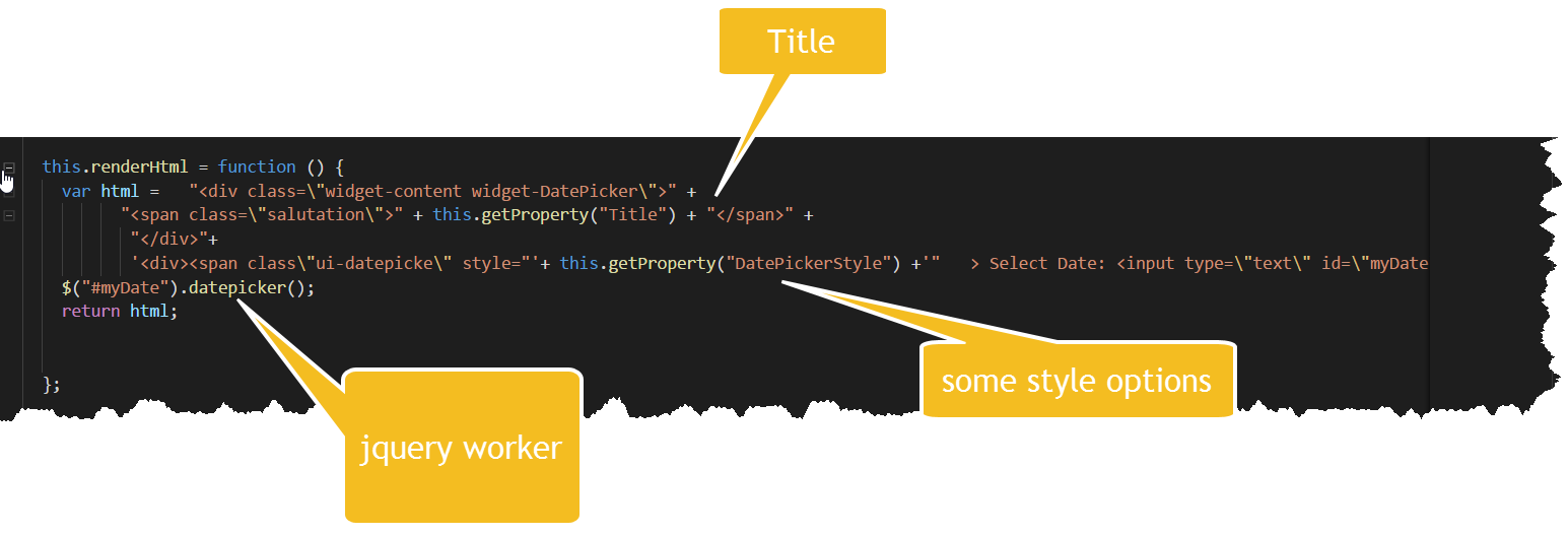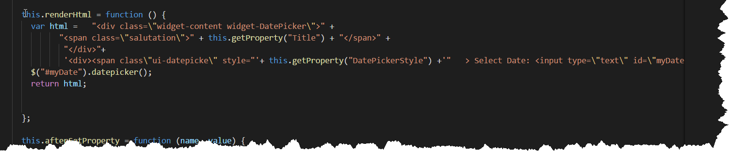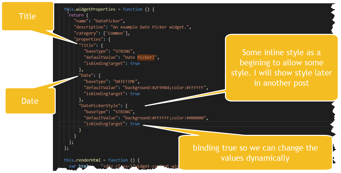 Before we get into the renderHtml I realize I need to quickly talk about the widgetProperties function in the ide.js. This where we set what properties can be defined and whether they are dynamic. For example the thought it useful to have a Title , Date and some simple css style configurable options. Inside the widgetProprties we have properties section (json) and the basic pattern is