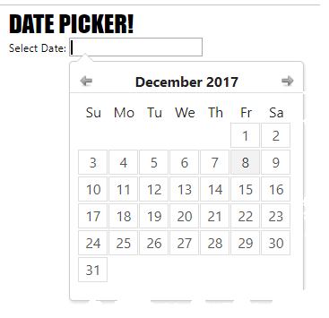 Because we don't want to write all of the logic that has been written many times will use a jquery datepicker https://jqueryui.com/datepicker/ which has a lot options.