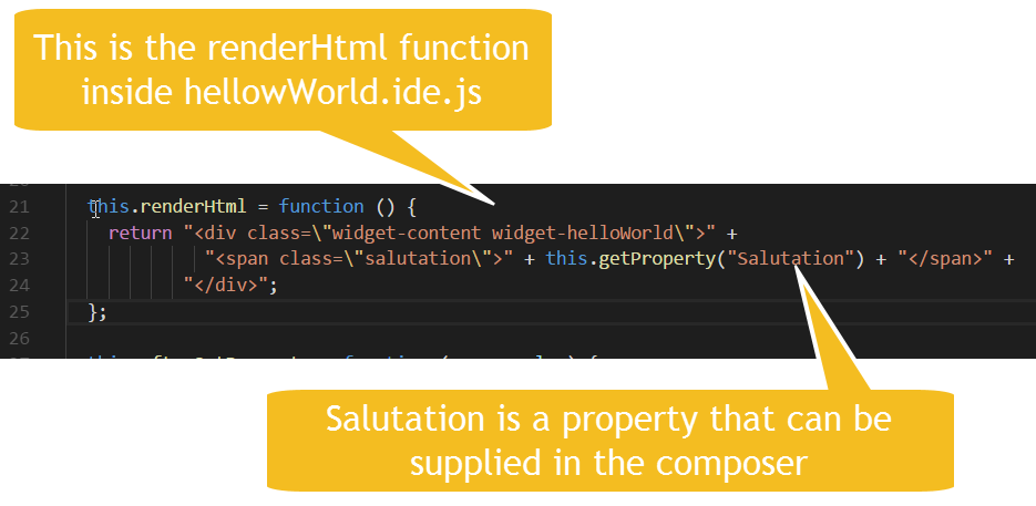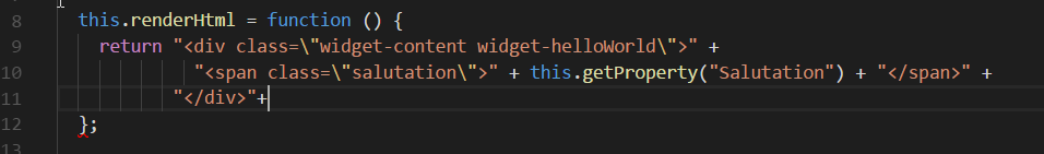 The js files are where most of the work is done. There a number of functions used inside the javascript file but just to get things going we will focus on the renderHtml function. This is the function that will generate the HTML to be inserted in the widget location.