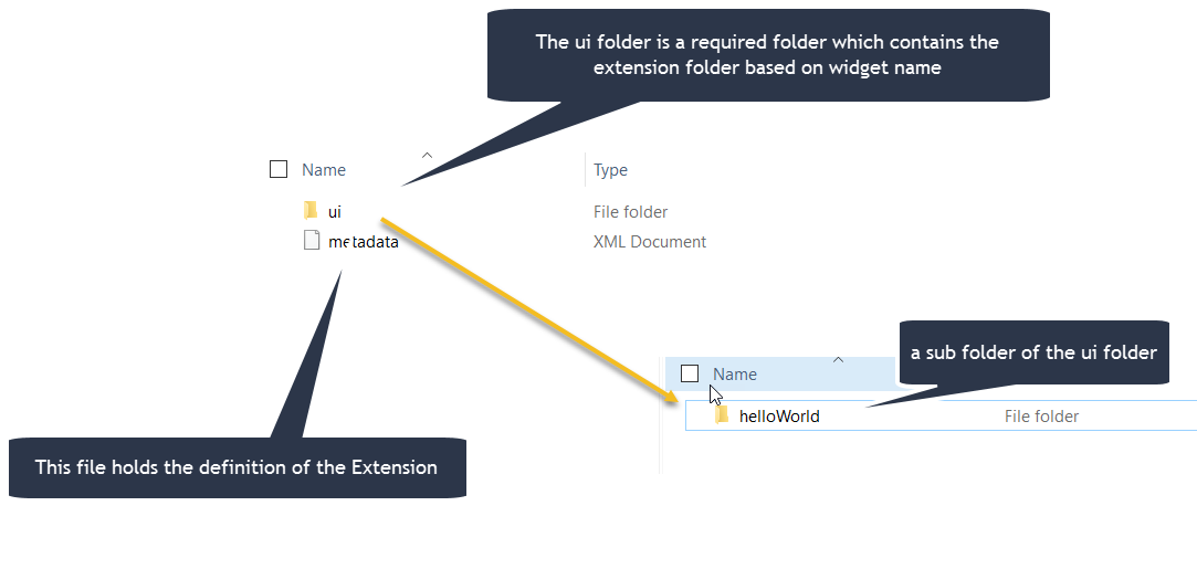 The attached zip when unzipped will contain a folder called ui and metadata xml file. Within the ui folder there needs to be a folder that has the same name as the widget name. In this case its helloworld.