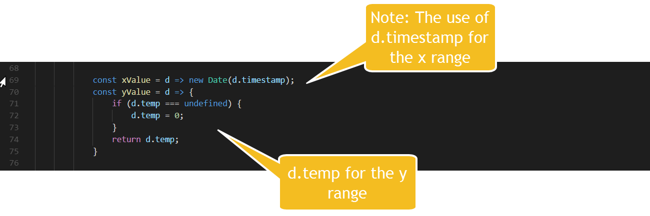 Next the x and y ranges need to be defined and notice that I have hardcoded for d.timestamp and d.temp these 2 are returned in the infotable rows