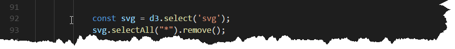 Define a svg variable and use D3 to select the div element defined in the init function. Also remove any existing elements this helps in the resize call.