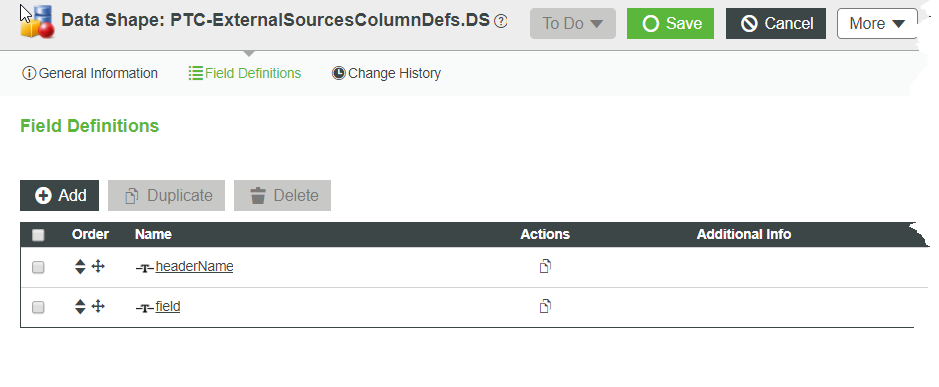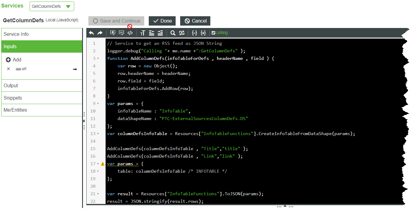 service script example uses a PTC-ExternalSourcesHelper thing below is the GetColumnsDefs service