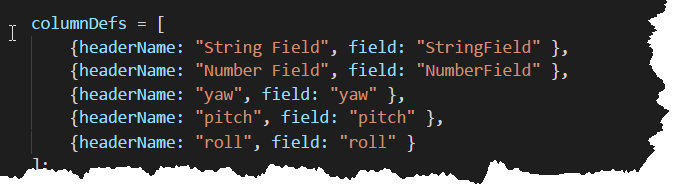 The columnsDefs takes the form of an Array of JSON basically headerName: and field The image below shows a hard-coded approach I took initially