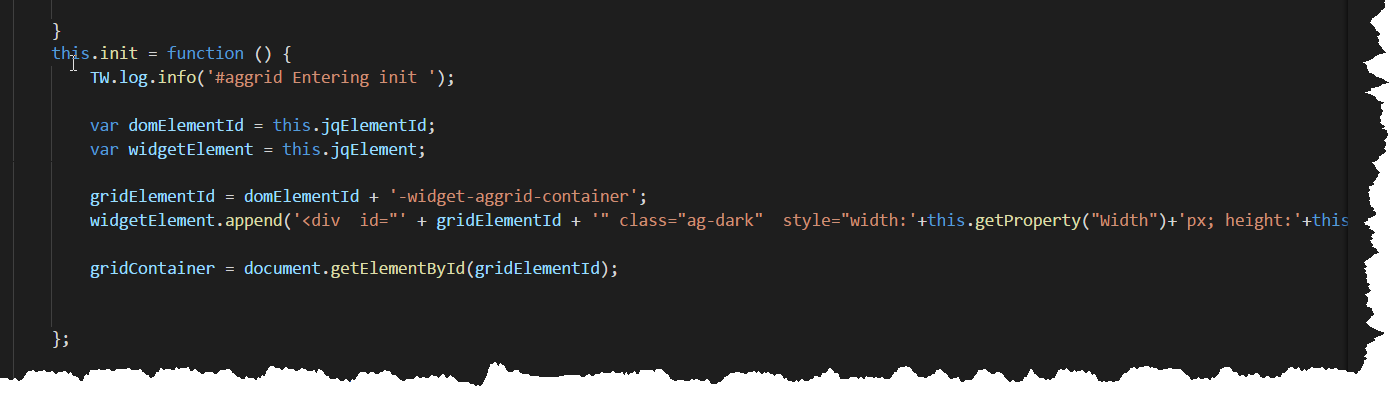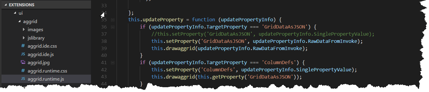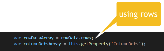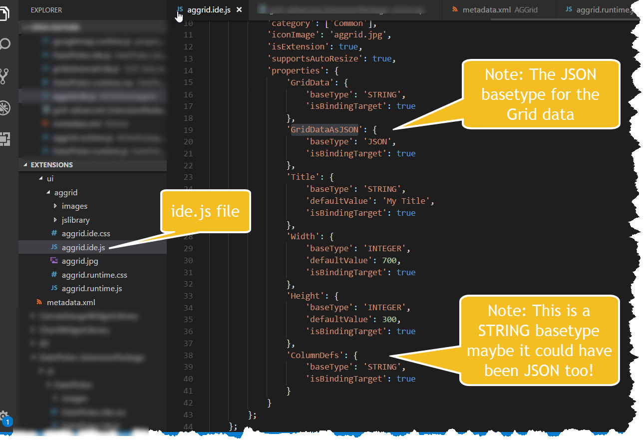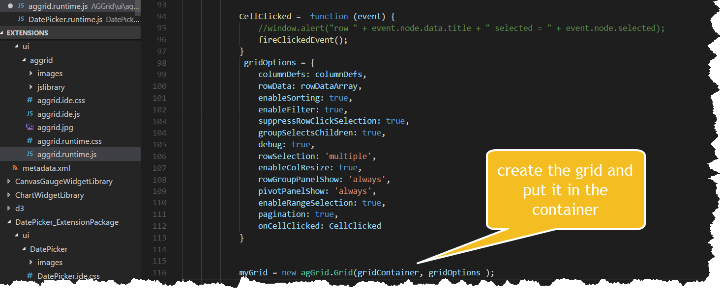 Both the columnDefs and the GridDataAsJSON (which turns into rowData) shown below are setup in the ide.js file (see previous posts for ide)