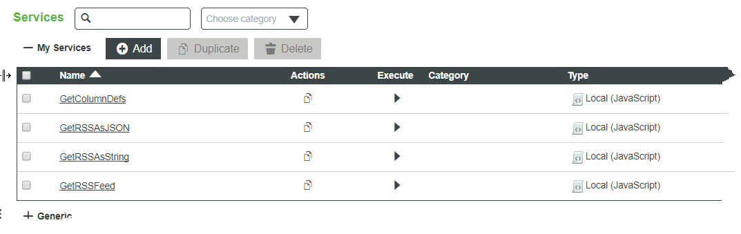 Returning back to the services we need to get some Grid data from an external source. For that we will create a GetRSSFeed and use that inside GetRSSAsJSON
