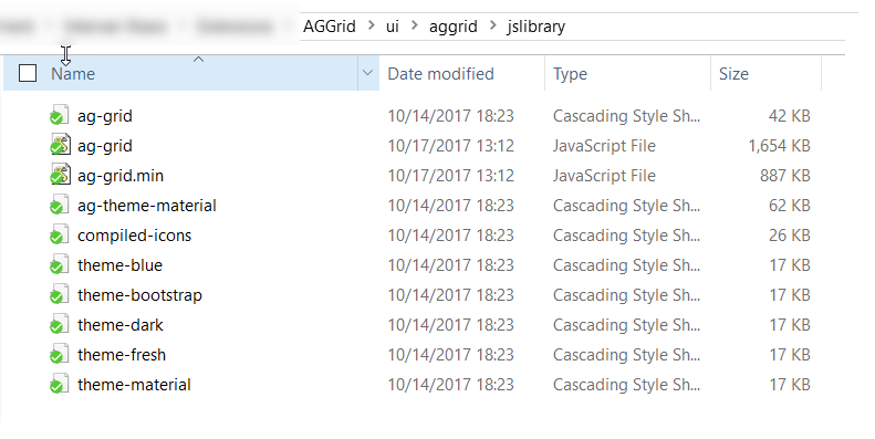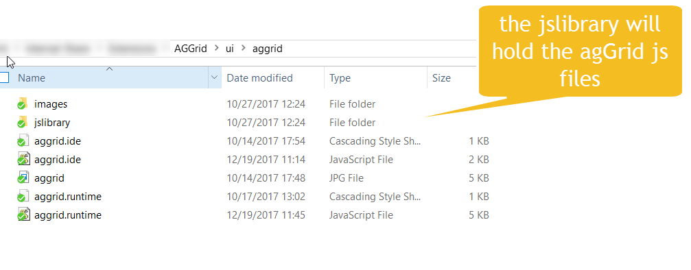 Below shows the jslibrary folder the main file we care about is the ag-grid (we could use the min file but initially have the full makes debugging easier)