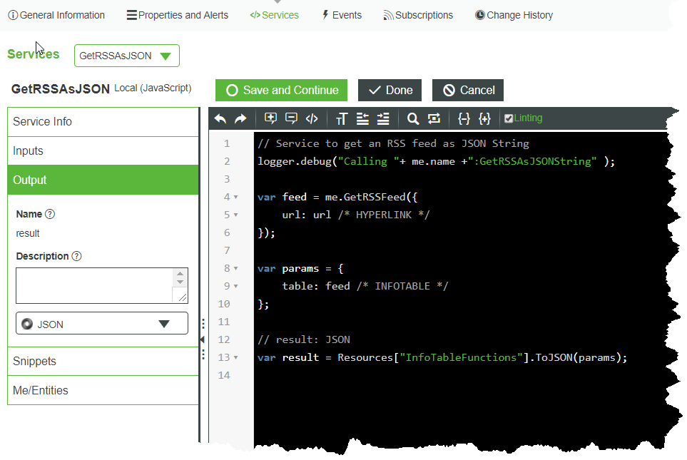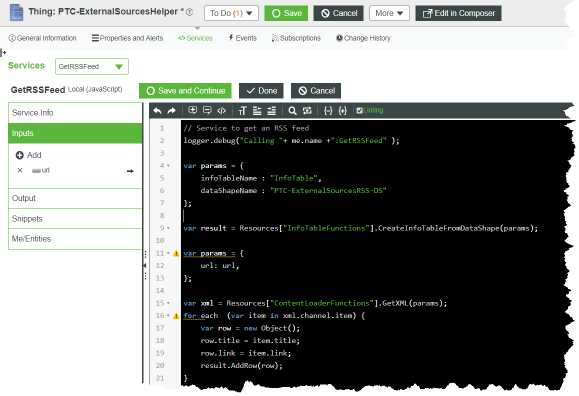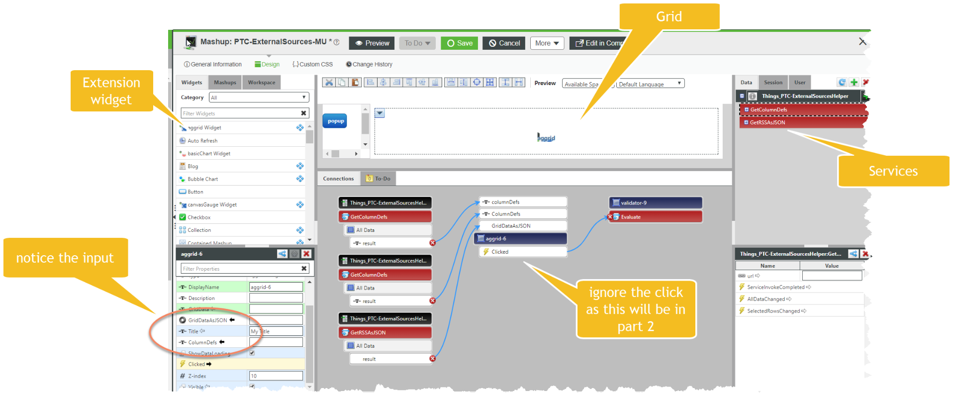 The next is to create a Mashup and add the PTC-ExternalSourcesHelper entity and wire up the GetColumsDefs and the GetRSSAsJSON to the agGrid widget