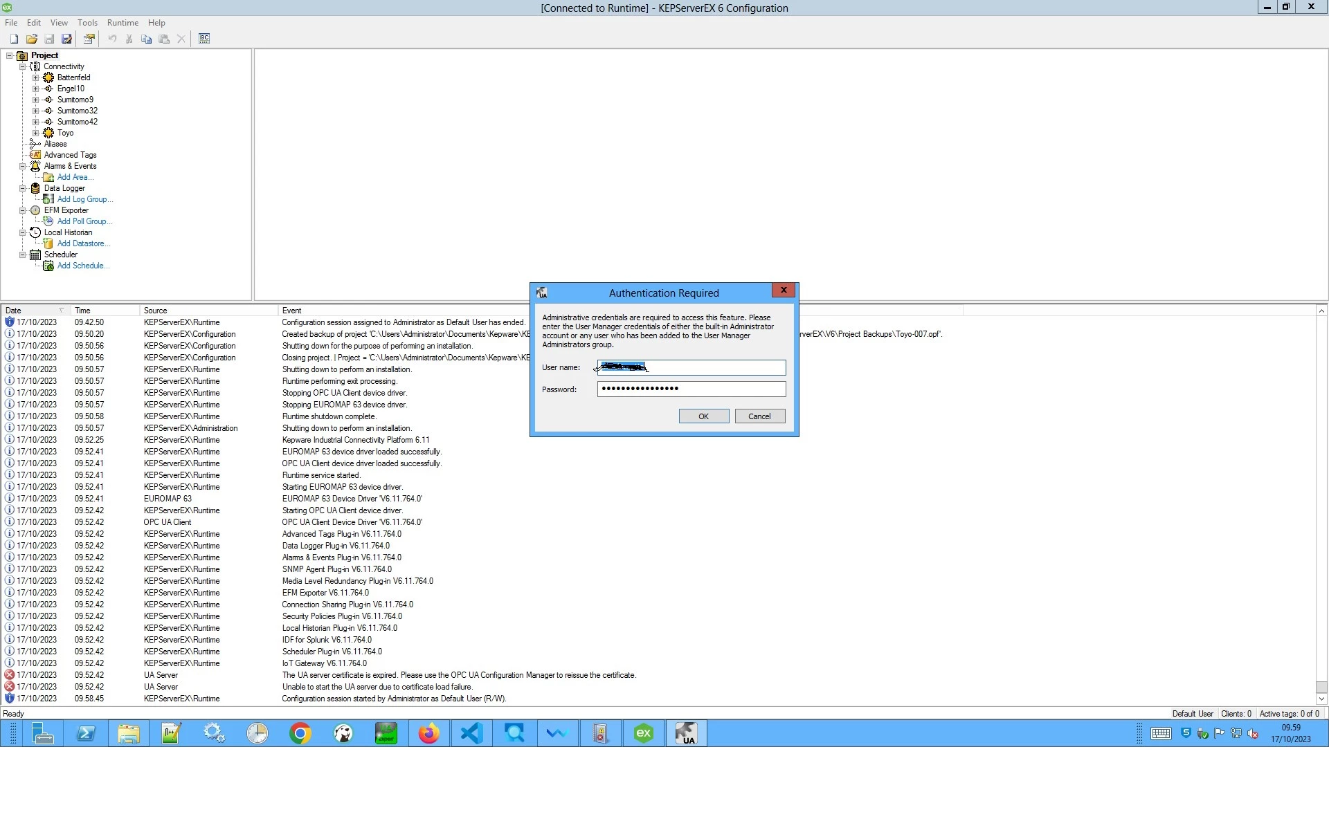 17/10/2023 09.52.42 Error UA Server The UA server certificate is expired. Please use the OPC UA Configuration Manager to reissue the certificate.