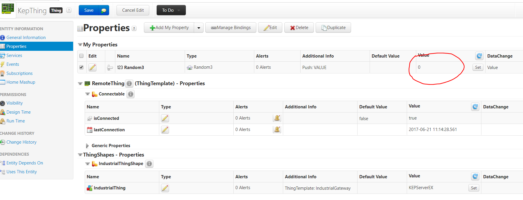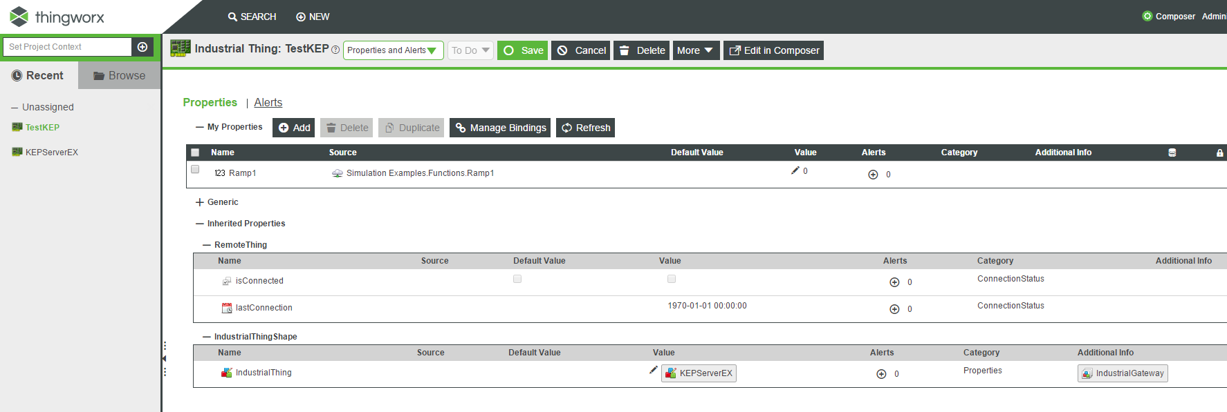 I have connected thingworx to kepware but I cannot see any values in thingworx. I have followed the guide "industrial Connections" in the Thingworx Help Center; I created a thing with the industrial gateway template, I connected kepware to the thing and, in new composer, I searched for the tags and bound them to a new entity. Everything good so far, but when I open the new industrial thing and click on Refresh to see the values, I cannot see any value. In the remote thing properties I can see that I has never been connected despite the Industrial Connection thing is connected.