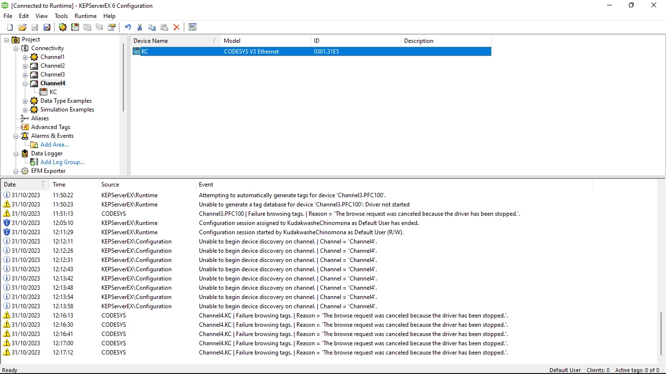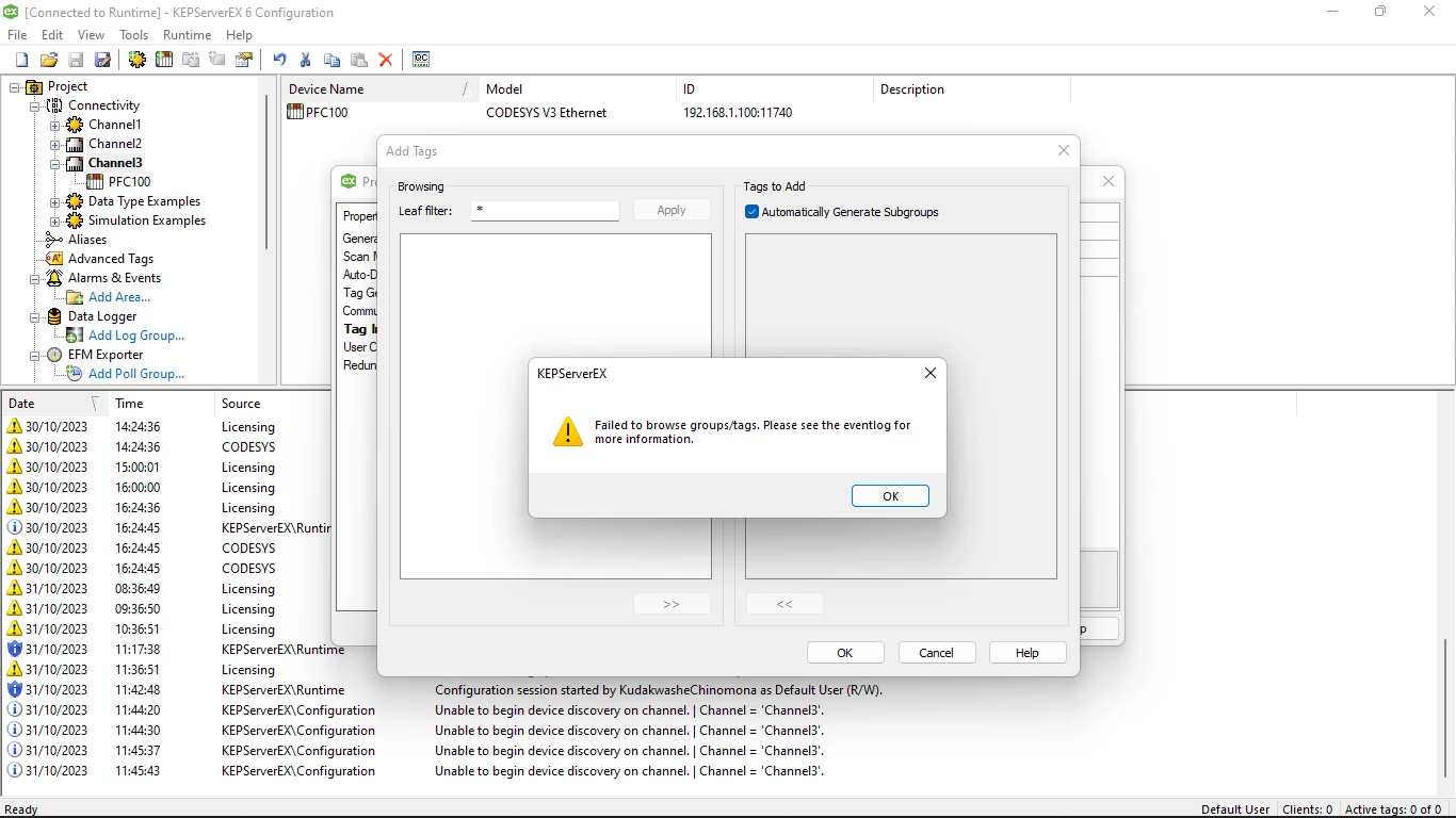 Good day. Can someone please assist me, I am trying to connect the codesys control win v3 x64 virtual PLC to the Kepserver OPC but it refuses. I can't browse the PLC tags as well. Even if use an actual PLC (wago PFC100), still it shows that there is no communication between my server and my PLC. Manually adding the tags, still there will be no communication between the server and The PLC. After adding a channel on Kepserver, when I try to use the discover device option to add the device, it's still refusing. When I manually add the device using the device address, still there is no communication. I have attached screenshots of the error messages which I am getting.