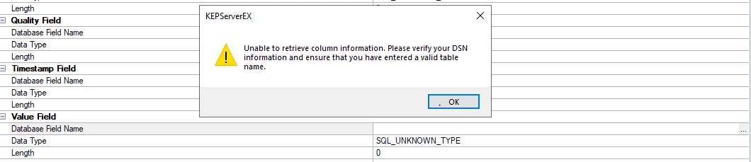 The Data Logger poped out a warning window showing "unable to retrieve column information" when I was setting up the column mapping for a tag. My ODBC data source (32bit) had been configured and tested successfully, so as the target table in the database. I tried reinitializing the enviorment and reconfiguring the data source but did not make any progress. The snapshots are attached below. Any suggestions are welcomed and appreciated.
