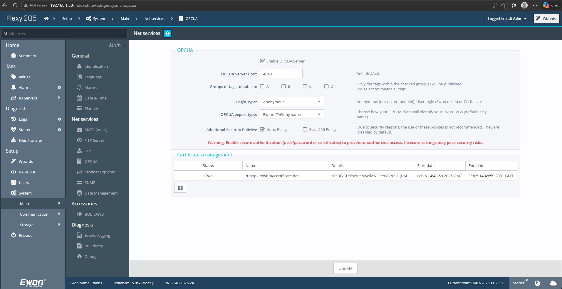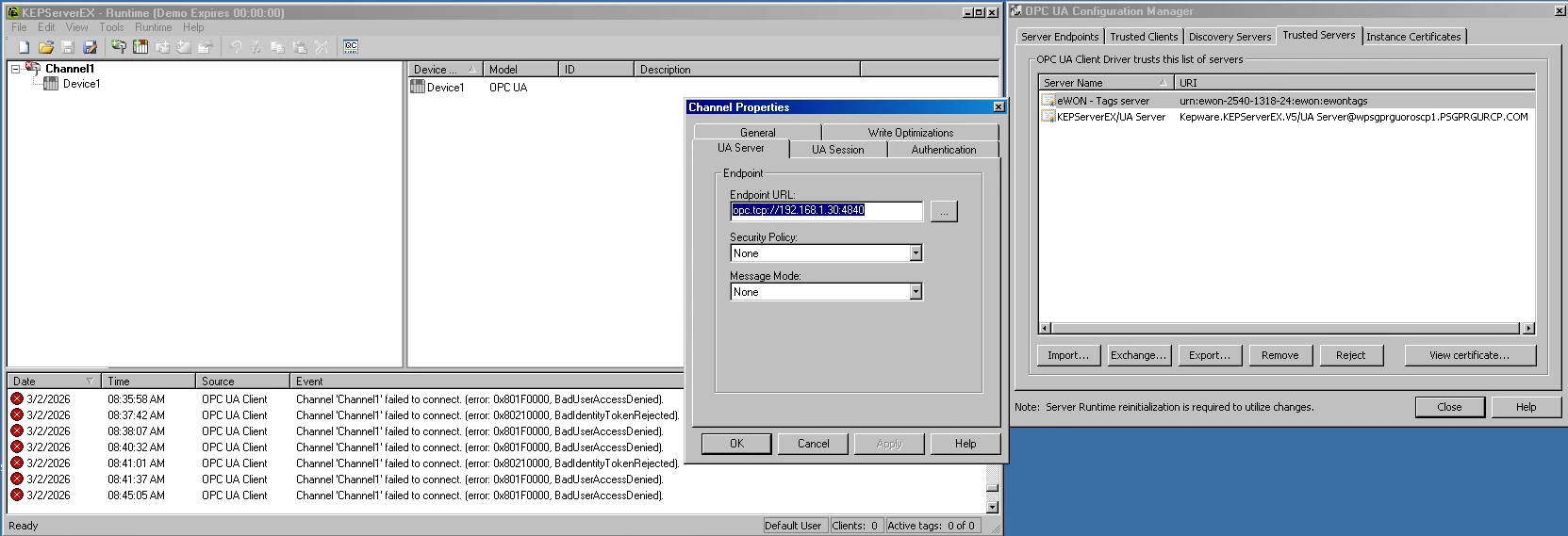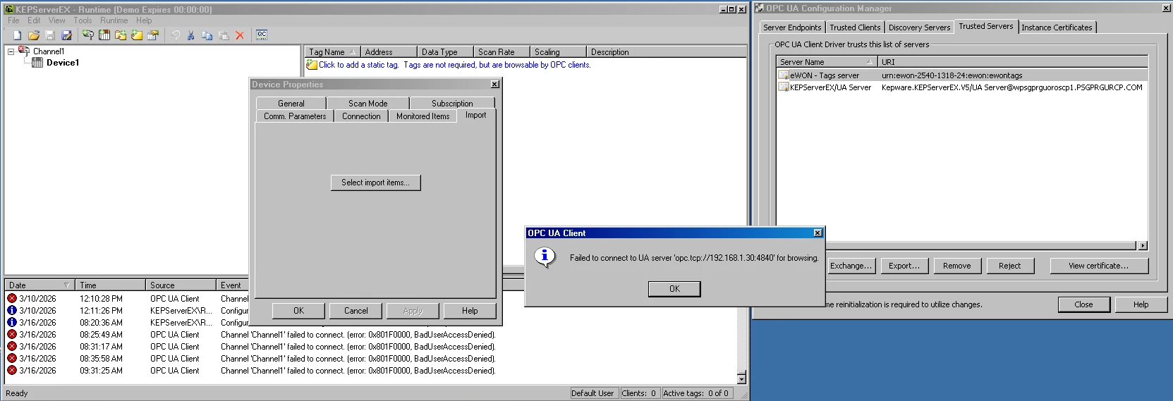 When configurating KepserverEX 5.8 channel i use OPC UA and configure UA server in the channel (see attachment 1) and when i try to import items on the device to import the tags of the Ewons an error appear (see attachement 2).