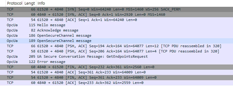 - Wireshark packet analysis shows that after sending a GetEndpointsRequest, the CIMON OPC UA Server returns this error.