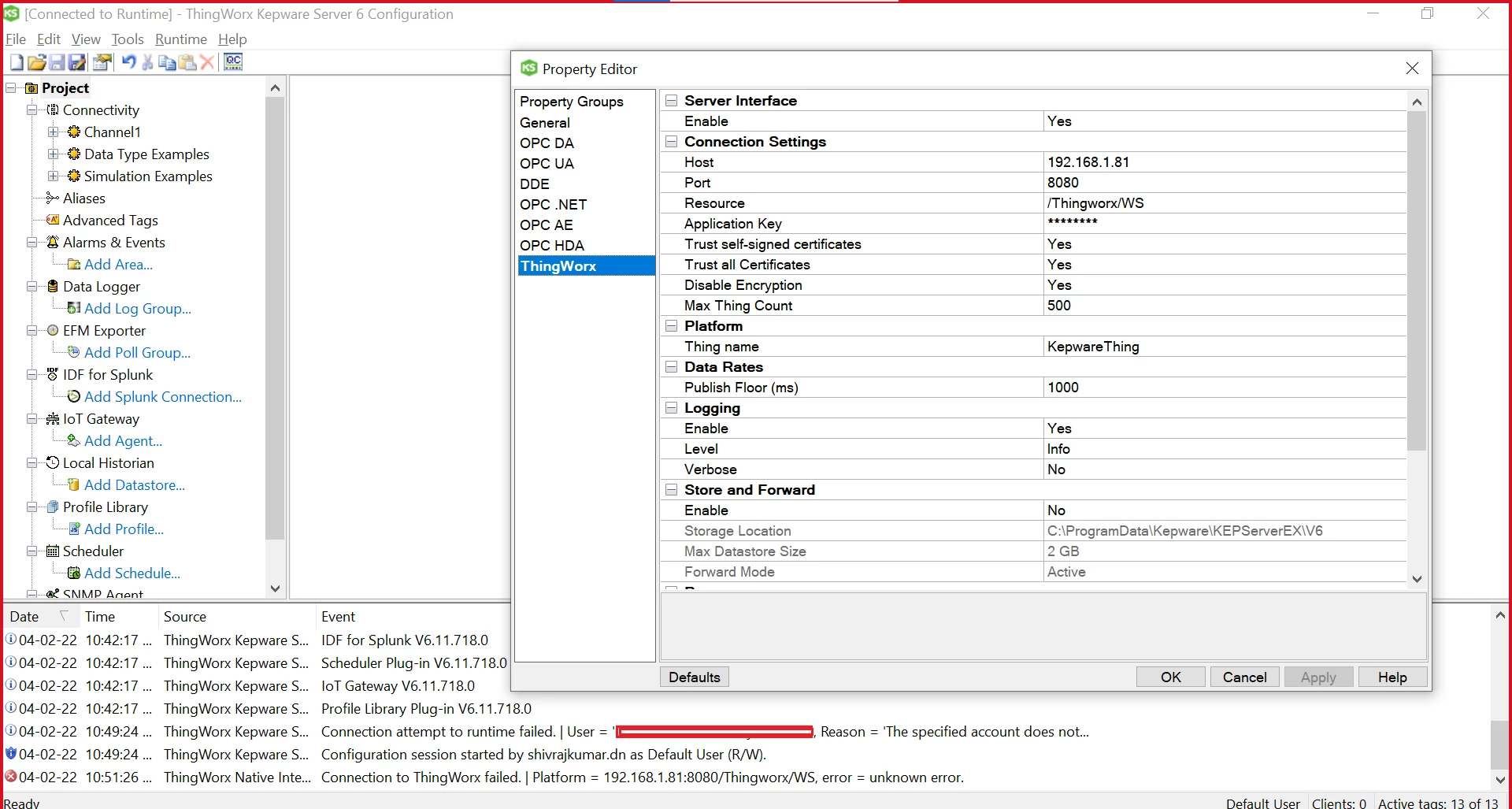Not able to connect to Thingworx from Kepware , Thingworx is running in Ubuntu server and Kepware is running on a windows server. Attached screenshot of the config done in properties.