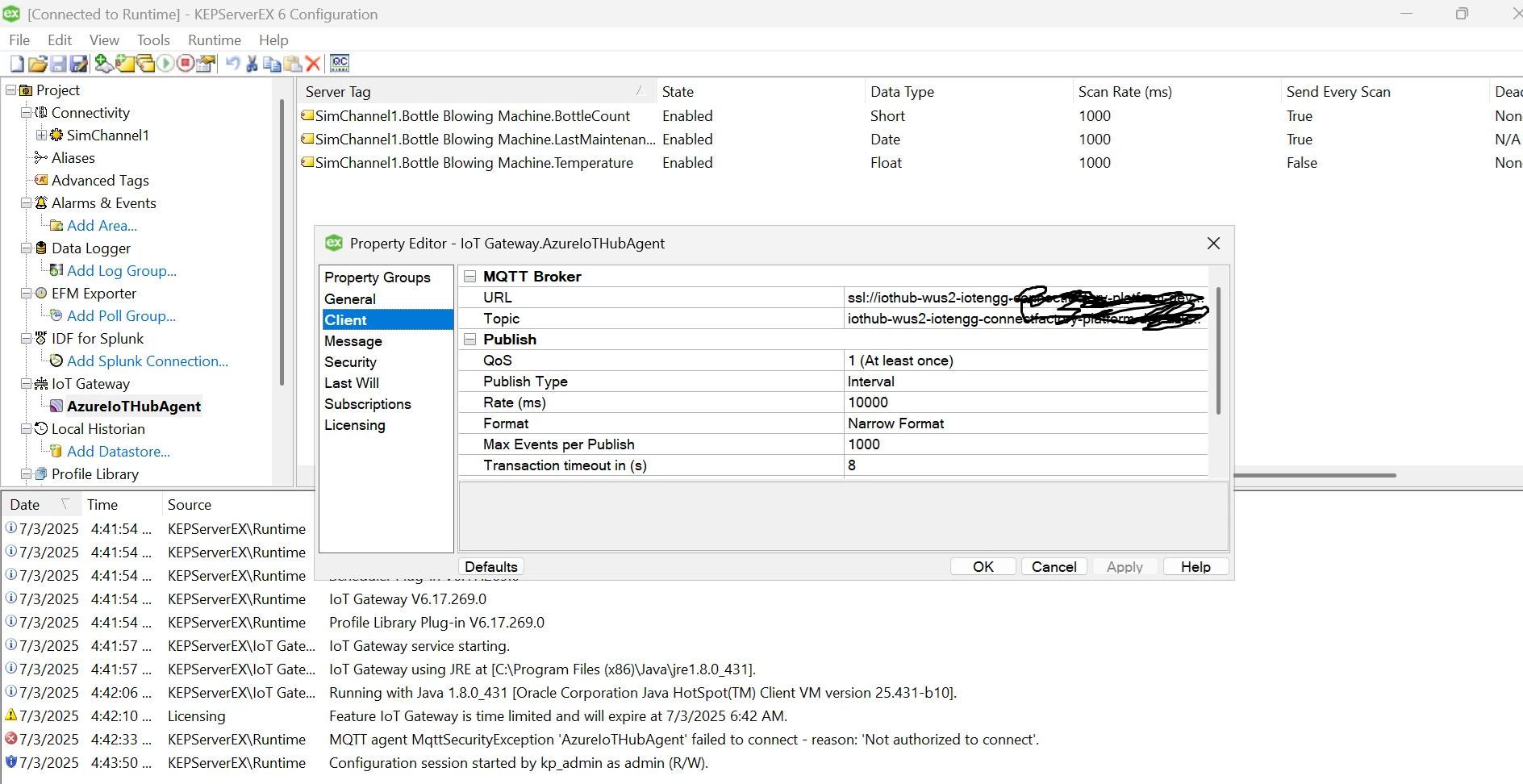 Still, kepware failed to connect Azure IoT Hub with the following error :