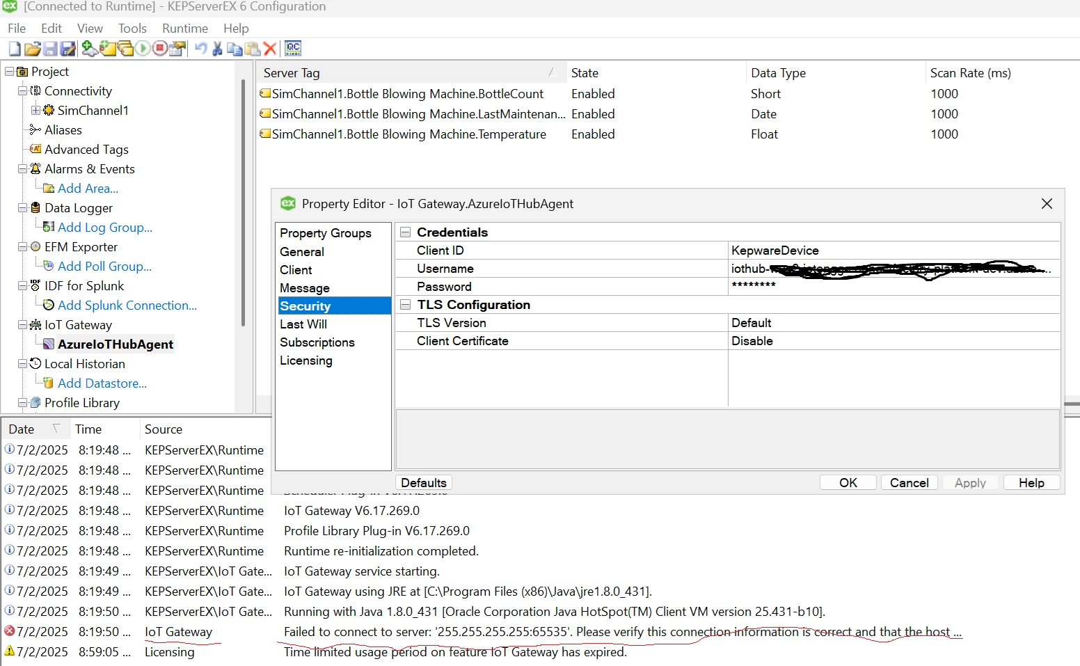 Issue: KepwareServerEx 6 failed to connect to Azure IoT Hub and device.