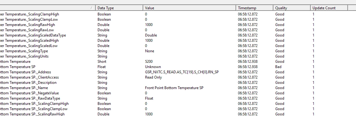 When I click on "Launch Quick Client Here" the quick client opens showing 640 tags. Most of which are unwanted. I have the timestamp for the opening time, quality Good and Update Count 1. All but two of the update count values remain at 1 and the time stamps for those value remain at the starting time. Two tags are updating every couple of seconds. Of the rest of the tags 7 are marked Bad. In the KepserverEx event log there are 12 tags marked "Unable to read tag" with a CIP Error = 0x5. Am I really getting data from the PLC? How can I tell if this is accurate? How do I make the other tags update like the two anomalies?