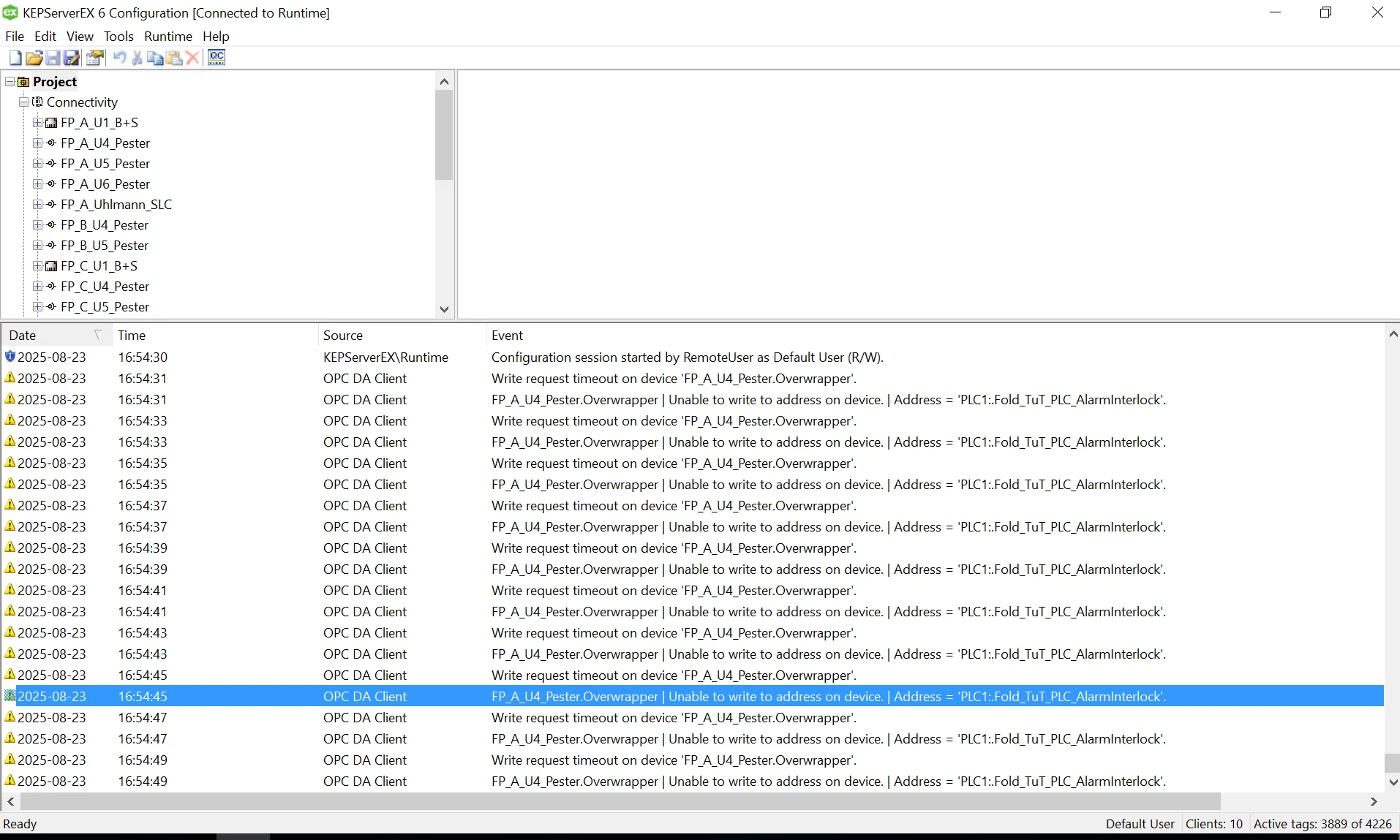 It looks like what’s happening is that KEPServerEX is trying to write to your PLC tag, but the write request is timing out before the PLC acknowledges it. Even though you see the boolean value eventually get set in the PLC, the communication layer is still throwing a timeout warning because it doesn’t get a proper confirmation from the device within the expected response time.
