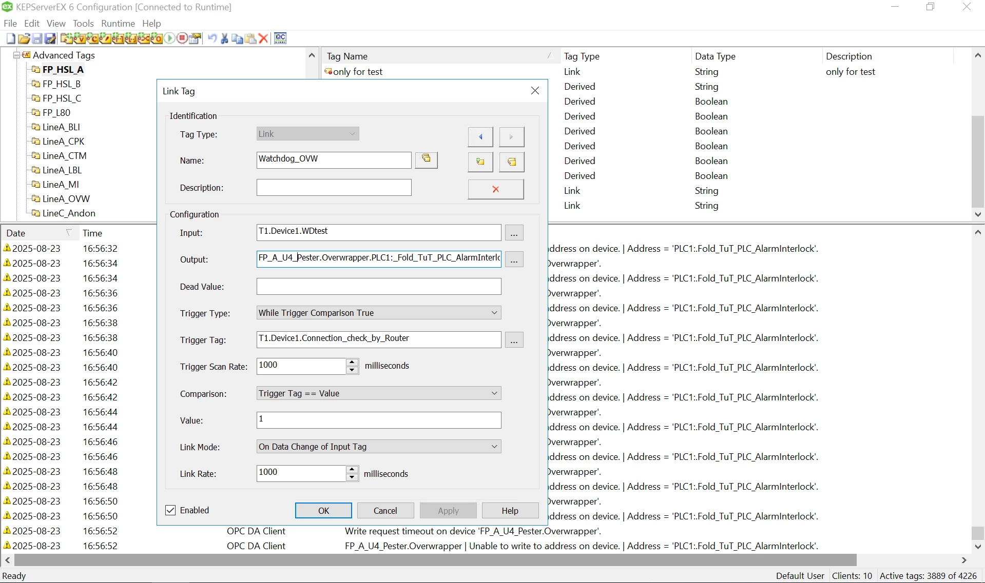 Your link tag is set to write “On Data Change of Input Tag”. If the trigger fires repeatedly or very quickly, you can get overlapping writes. Try increasing the scan rate or using “While Trigger True” mode carefully to avoid hammering the PLC with too many writes.
