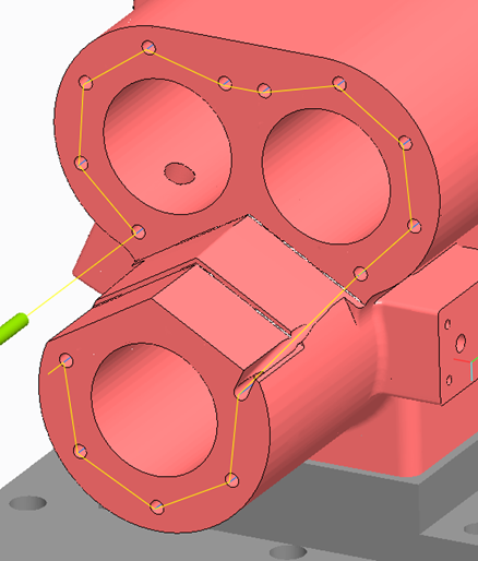 above is the same program in Creo 3 with ModuleWorks. Note the gouging going on. It does the same gouging on the drill, chamfer tool and tap. I've run this program on a machine and it does not gouge. It runs on the machine the same as the Vericut simulation.