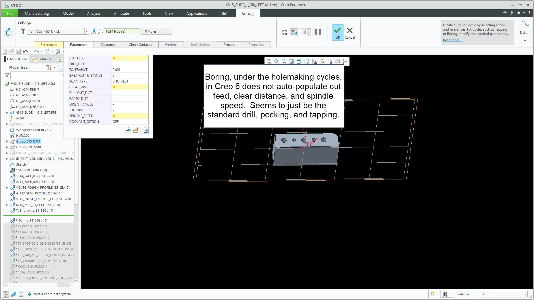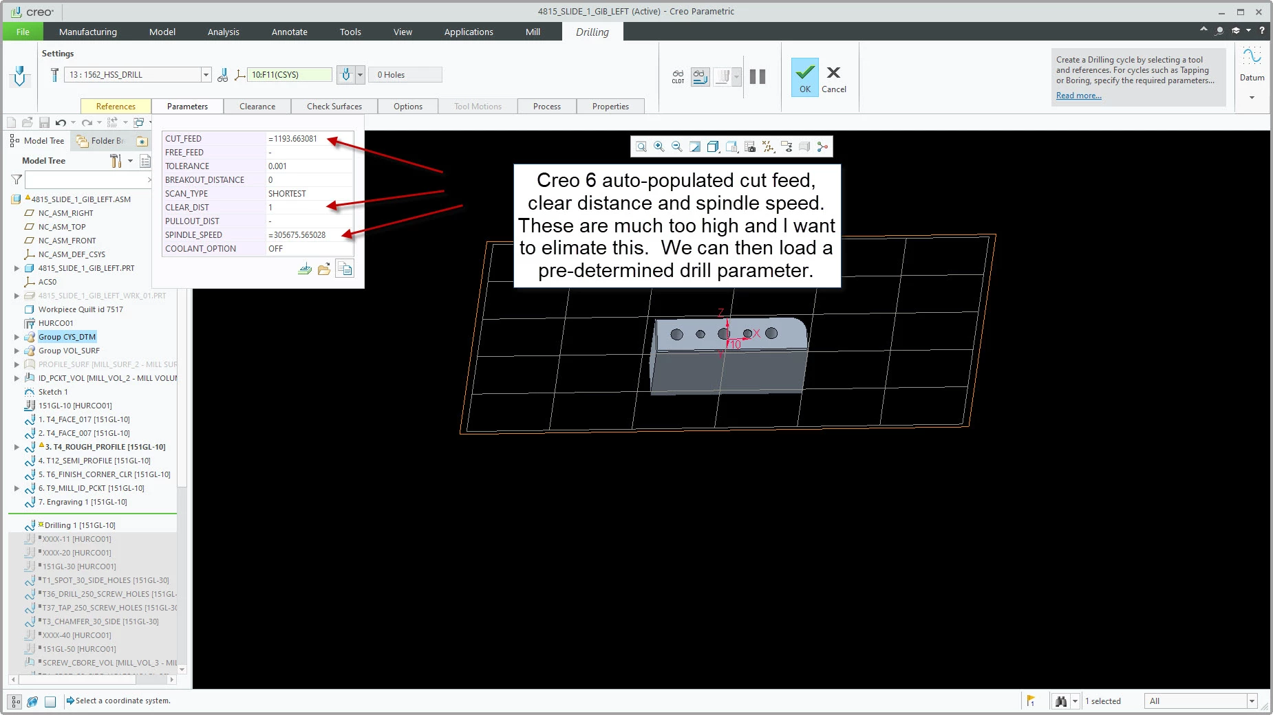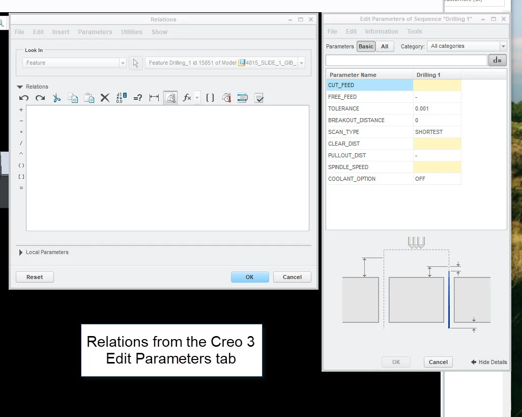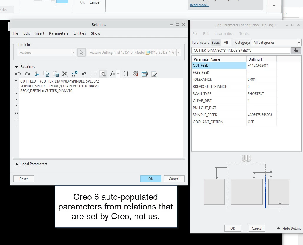 Good morning. Wondering if anyone can help me with something for my programming guys. We are in process of moving to Creo 6 for machine programming and one my guys noticed when he is doing a standard drilling cycle, pecking, or tapping that the parameters for the tools selected are being auto-populated by a relation and not leaving the parameter tab yellow, signaling to my guys they still need to select the right pre-made drill parameter file for the operation. The auto-populated amounts are extremely high cut feeds and spindle speeds. The concern here is if the auto-populated amounts get forgotten and not changed it could be bad. In Creo 3, which we use now, it does not do this and leaves the tab yellow with empty cut feeds and spindle speeds, even after the tool is selected. We can then go and select a drilling parameter to use which will fill in the proper feeds and speeds. I'm wondering how I can eliminate these auto-populated relations that are created for the standard drilling cycle? I've attached some images of what I'm talking about. Hopefully this makes sense.