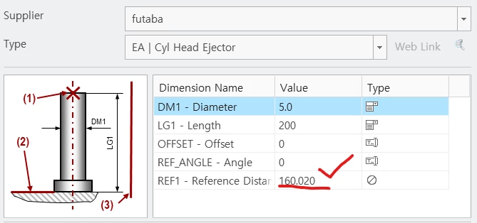 your images displays not the actual length of the ejector pin. It is the reference distances between the selected point and the ejector head surface. This distance is used to select the proper ejector pin length.