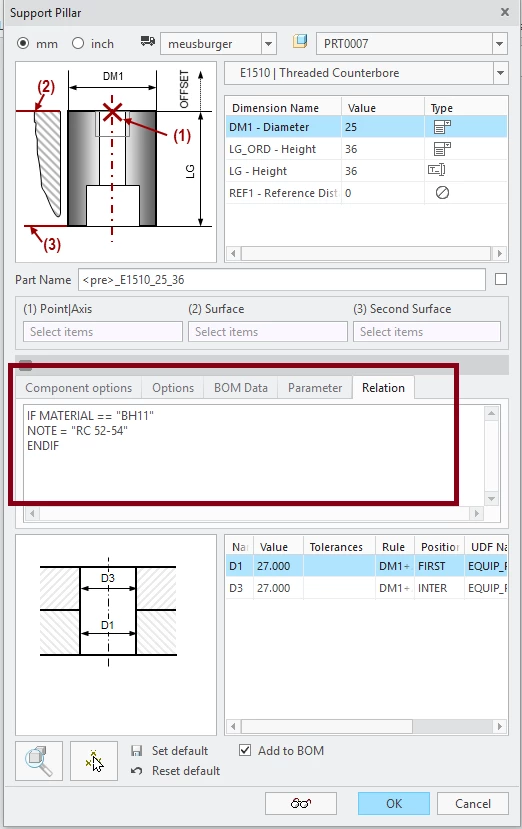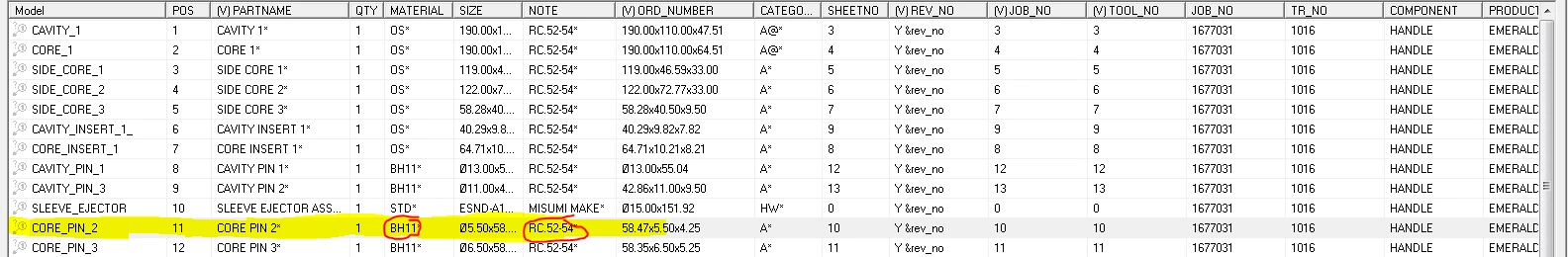 4. For the partforming elements(i.e core, cavity, cavity insert, side core, core insert) , we need to change the names manually in the [v]PARTNAME column of the BOM according to our company standards. Can this be automated?