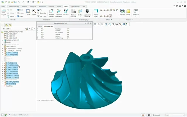 Tool paths are created in Creo 2 manufacturing suite (video 1). Kinematic workcell model was configured (including travel limits for linear and rotary axes) and Machine tool simulation was done (Video 2). Complete tool path was verified in Vericut for material removal simulation.