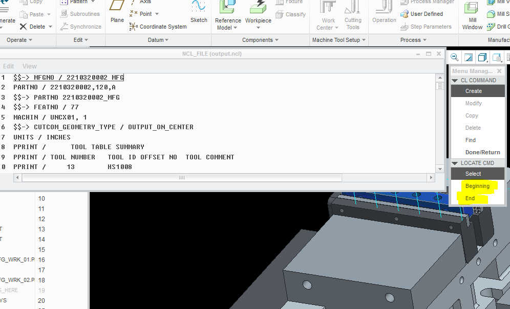 The only other option that I can find is by going to manufacturing tab and then selecting Edit/CL Command, however this only allows me to select "beginning" or "end" for my placement of code, and does not allow me to specifically place lines of code like I am attempting to do. In this mode I can also select Edit/Edit Mode in the code window and change the code and then save it, but it does not seem to keep my added CL Code. I just want to be able to add or edit CL Code on any line that I desire, anyone have any ideas?