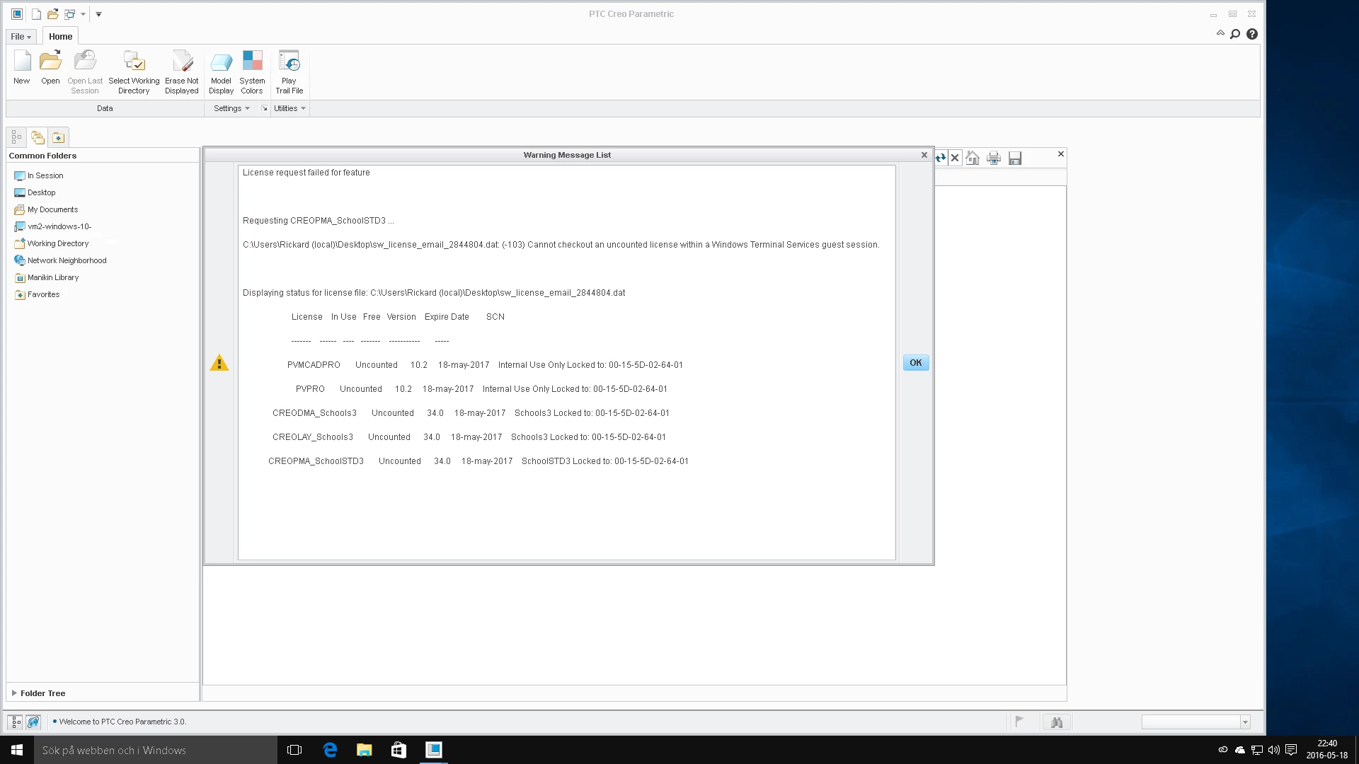 I have installed PTC Creo on a virtual machine in Hyper V, Windows Server 2012 r2, and then I connect to the VM through Windows Remote Desktop. It works fine when I run it locally on the server but it won't work when I remotely connected to the VM.