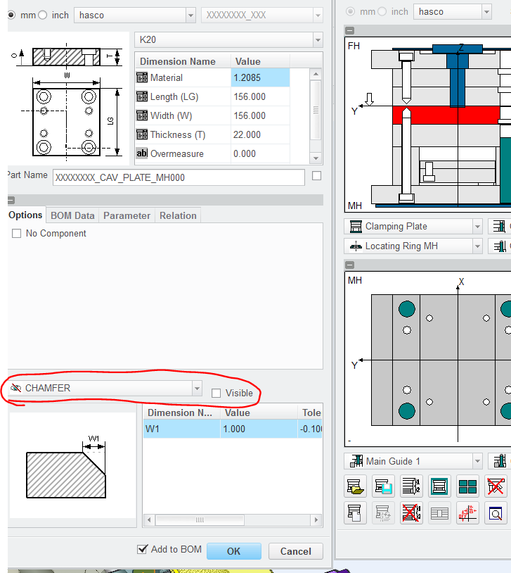 How or where to find the parameter that controls the automatic generated champfer inside the assembly definition in EMX? I would like it to be visible always when i build up a moldbase using EMX.