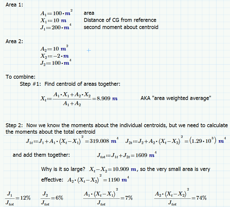What I then struggle with is combining the second moments of the two shapes. I am of the belief that I can get the overall second moment of the entire waterplane by adding the two individual second moments about centroids i.e. JoL = JL (for the ship) + JL (for the appendage)