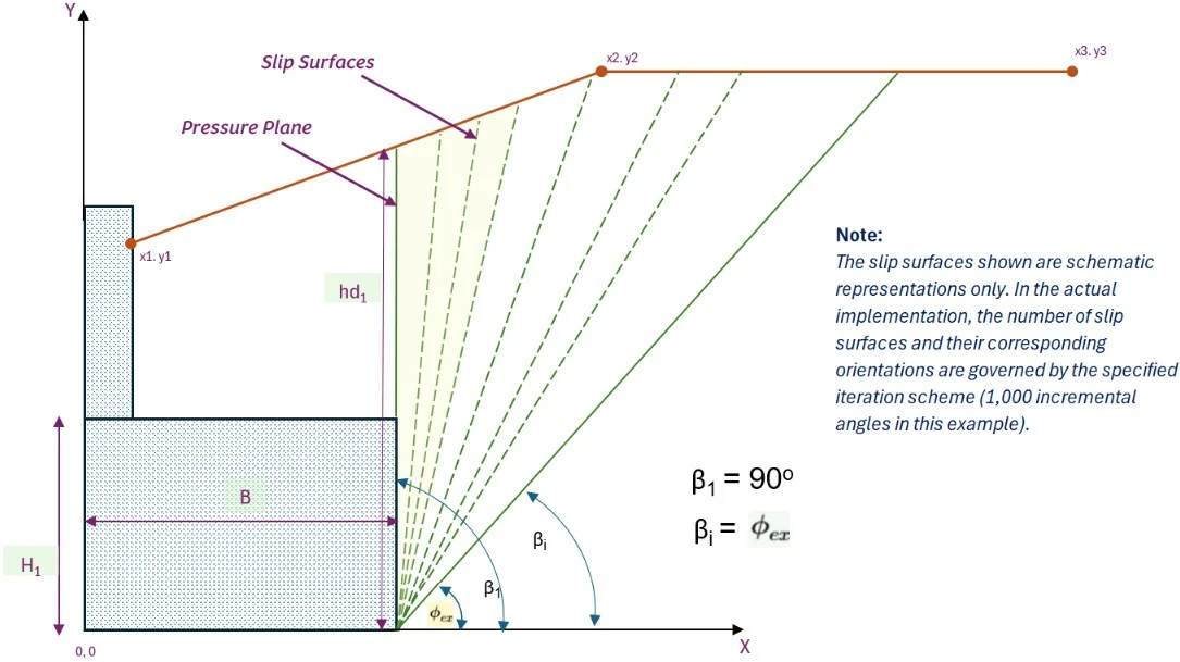 "If the surcharge region overlaps the critical wedge, only the overlapping length is considered."