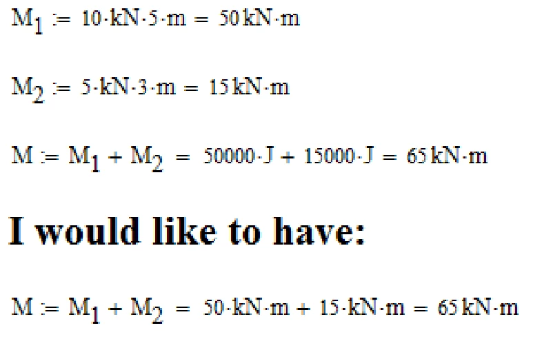 Mathcad does not simplify when you assign a variable, so defining M3:=10kN*5m stores the units kN*m, no simplification to Joule is made.