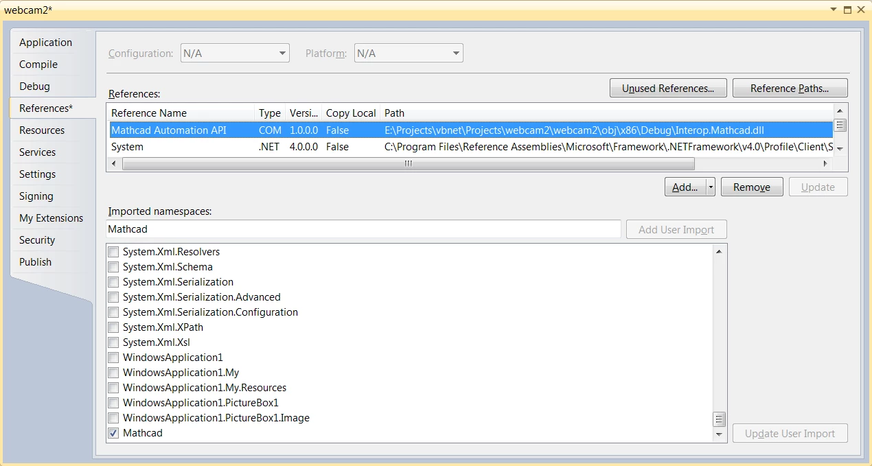 I don't have vs2010 set up to open your vb project, but the short answer is yes, Matchad can do what you ask. However, you need to create a dll interface to whatever funtions you want to call by linking to the Mathcad c library dll. That means creating a dll, as described by andy, that calls whatever language/function you want. In this case, it appears you've created a dll that Mathcad can't call, so the interface dll to Mathcad will also need to be linked to the exported functions in that dll by whatever library you've created. At that point, the c/c++ Mathcad interface code can then call the functions in the vb dll.