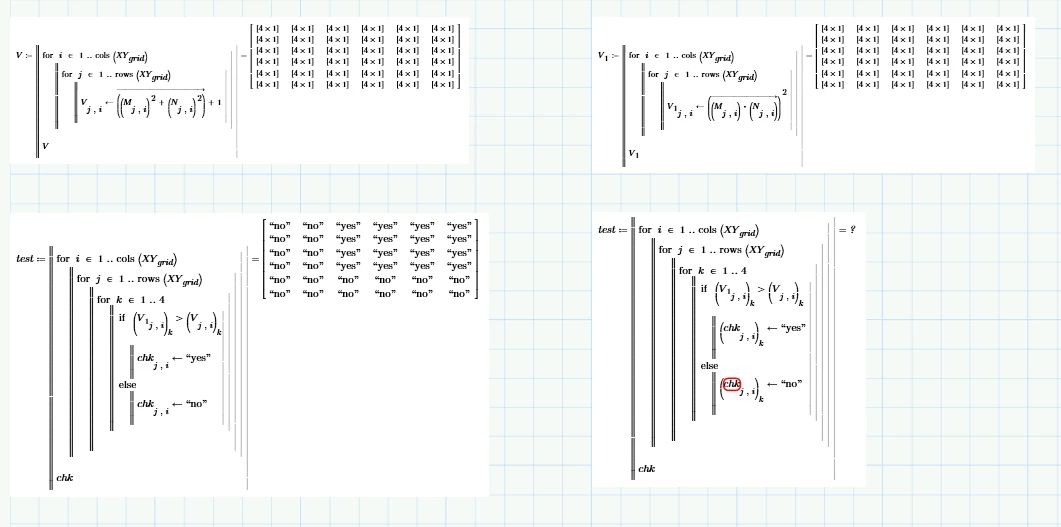Attempting to do basic "For Loop" program on a nested matrix/vector using Mathcad prime 4.0. As you can see below the right "test" program snippet is displaying an error.The error message I get is reads "This operation can only be performed on an array". The left "test" program snippet is performing the evaluation when the "k" counter is omitted from "chk" variable. In this case returning result for "k" = 4. I was anticipating right "test" program snippet returns a [4x1] matrix or vector after evaluating for each "k" value.