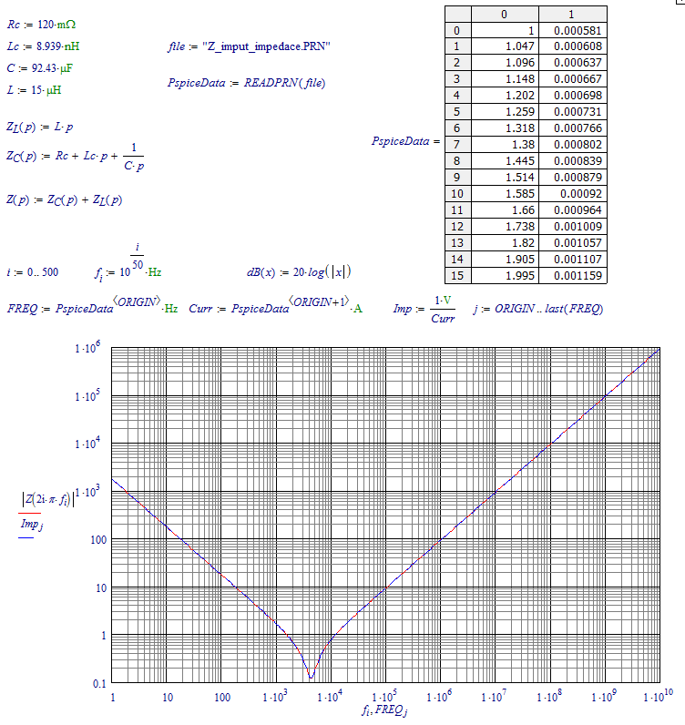 As you can see, the (solid) red line of the Mathcad model coincides with the (dashed) blue line of the Pspice output.