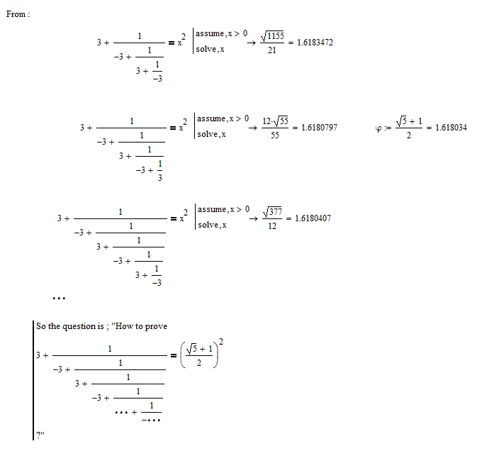 How to prove : 3 + 1| / |-3 + 1| / |3 + ... = phi^2 ?