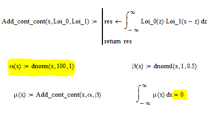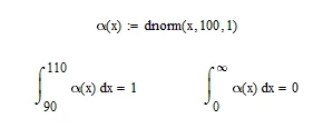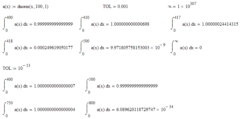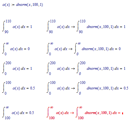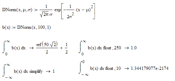 I define a function as a density of probability, so its integral should be 1, but I don't get 1 with some certain bounds. In the picture I have enclosed to the question, you can see that when I integrate a normal law of parameters (μ=100,σ=1) on the interval [90,110], the result is 1. But when I integrate the same function on the interval [0,∞[, the result is 0.