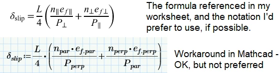 For all of Mathcad's reputation as being a primary math software, it's always a little frustrating that it can't seem to replicate and utilize the math notation commonly used in textbooks, reference books, etc. Many, many references will use special characters of some type in their variable names, but this seems to be next to impossible to replicate in Mathcad worksheets, so I have to use alternate naming for those variables, and then add text noting that this variable is really the one everyone is familiar with that uses a symbol in the variable name. For instance, when referencing stresses parallel and perpendicular to the plane of interest, it's not unusual to use a term like f‖ and f┴ to denote those. (See the screenshot below for how these are were supposed to look. They looked exactly like they were supposed to when I typed them, but then I hit "post" and the editor removed the "invalid HTML" [subscripts]) Anyway, symbols like that in the variable subscripts are common, clear, recognizable because that's how it's shown in authoritative references that we are often basing our worksheets on, and also only 1 character so already-long formulas don't get unmanageably long.