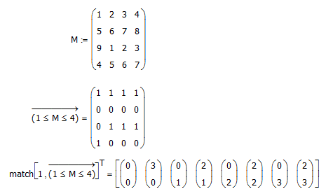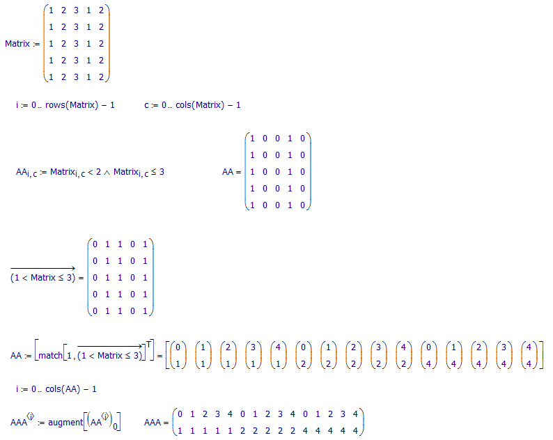 I'm a MathCAD 15 user. Does MathCAD have logical indexing function? In other words I want to find the indices in a matrix where the values of the matrix are within some criteria. For instance I would like to find the row and column numbers in the matrix below that are between -3.8 < G(i,j) < 2.3? Sure I could write a small function to do this but if I were using Matlab A=G(G<2.3 & G>-3.8) would get me what I need.