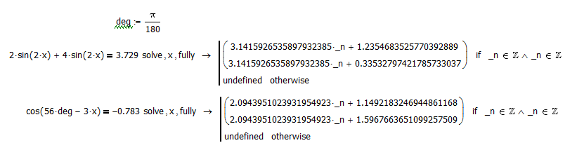 First one is 2sin^2(2x)+4sin(2x)=3.729, second one is cos(56-3x)=-0.783 (56 is in degrees)