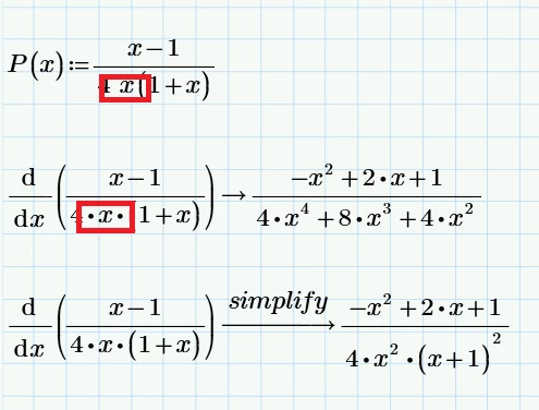 d[(x-1)/(4x*(1+x))]/dx, Mathcad gives the answer as [(-x+1)*x'*(x+1)+x(x+1)]/[4x*(x+1)^2], which is wrong. Would you please advise if anything caused such wrong answer?